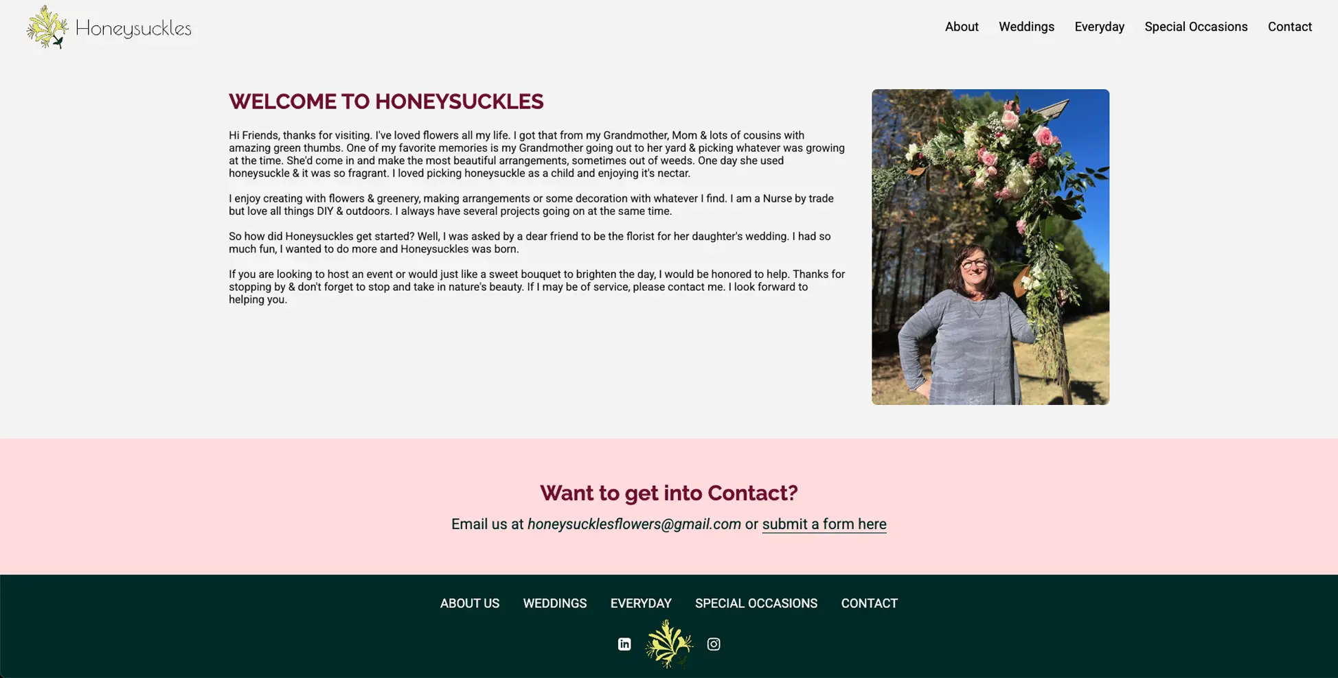 The client needed a website that reflected the beauty and craftsmanship of their custom floral work. I crafted an elegant, visually-led experience that highlights the different offerings — arrangements, special occasions, and mainly weddings — in one responsive application. Additionally a contact form with custom HTML directly to the business owner.